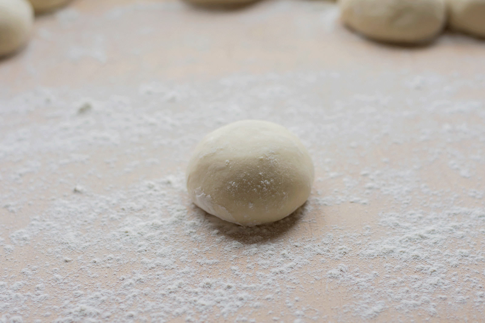 Mąkę, sól, olej, masło i jajka umieszczamy w dużej misce. Dolewamy aktywne drożdże i zagniatamy gładkie, elastyczne ciasto. Gęstość ciasta regulujemy mąką lub mlekiem. Następnie formujemy z niego kulę. Przekładamy ją na bawełnianą, czystą szmatkę i obwiązujemy gumką tworząc sakiewkę. Tak zabezpieczone ciasto umieszczamy w misce wypełnionej letnią wodą (powinno opaść na dno). Po około 20 minutach, gdy ciasto wypłynie na wierzch, zdejmujemy ściereczkę i wyrabiamy ponownie masę na stolnicy. Odstawiamy ją na 20 minut.